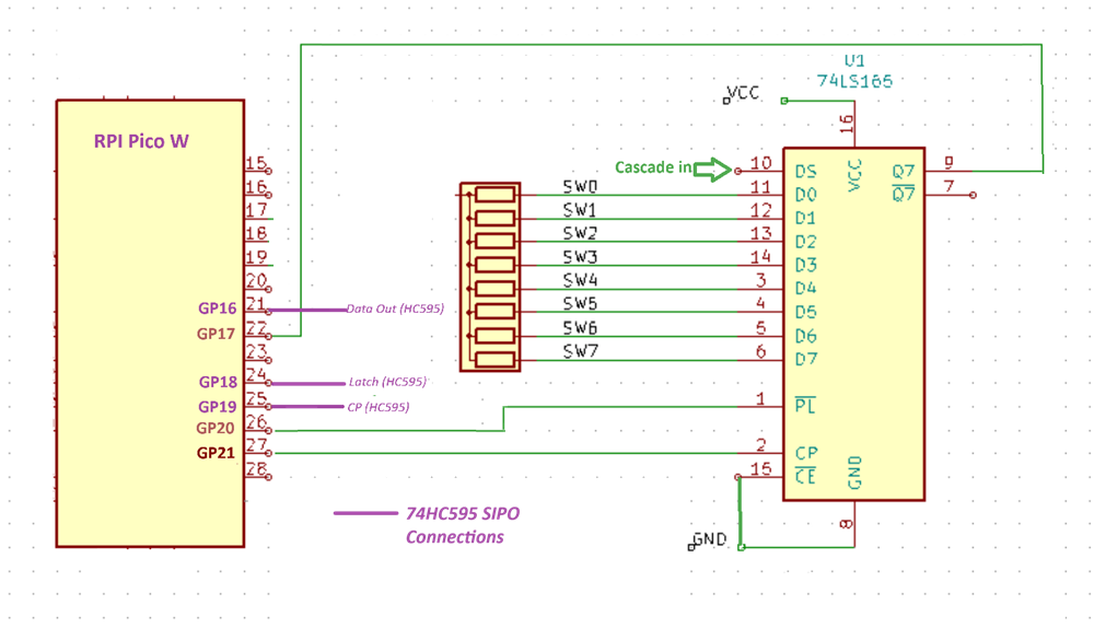 | Function | RPI Pico Pin | 74HC165 Pin | Function | |