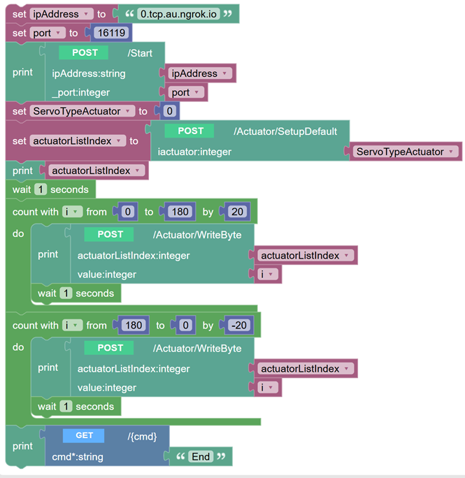 You would then use 0.tcp.au.ngrok.io and 16119 in Blockly; for example see below in the example.