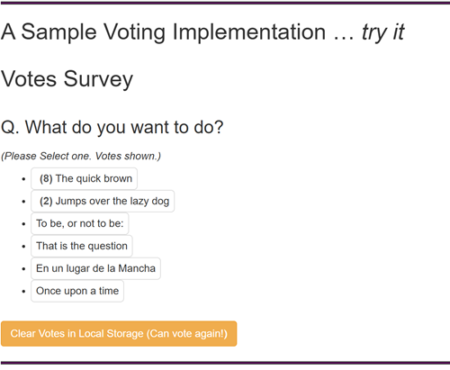 Note that you can only vote once. For development purposes there is though a [Clear Votes] button which allows you to re-vote. It does not clear votes from the Blob Storage.
